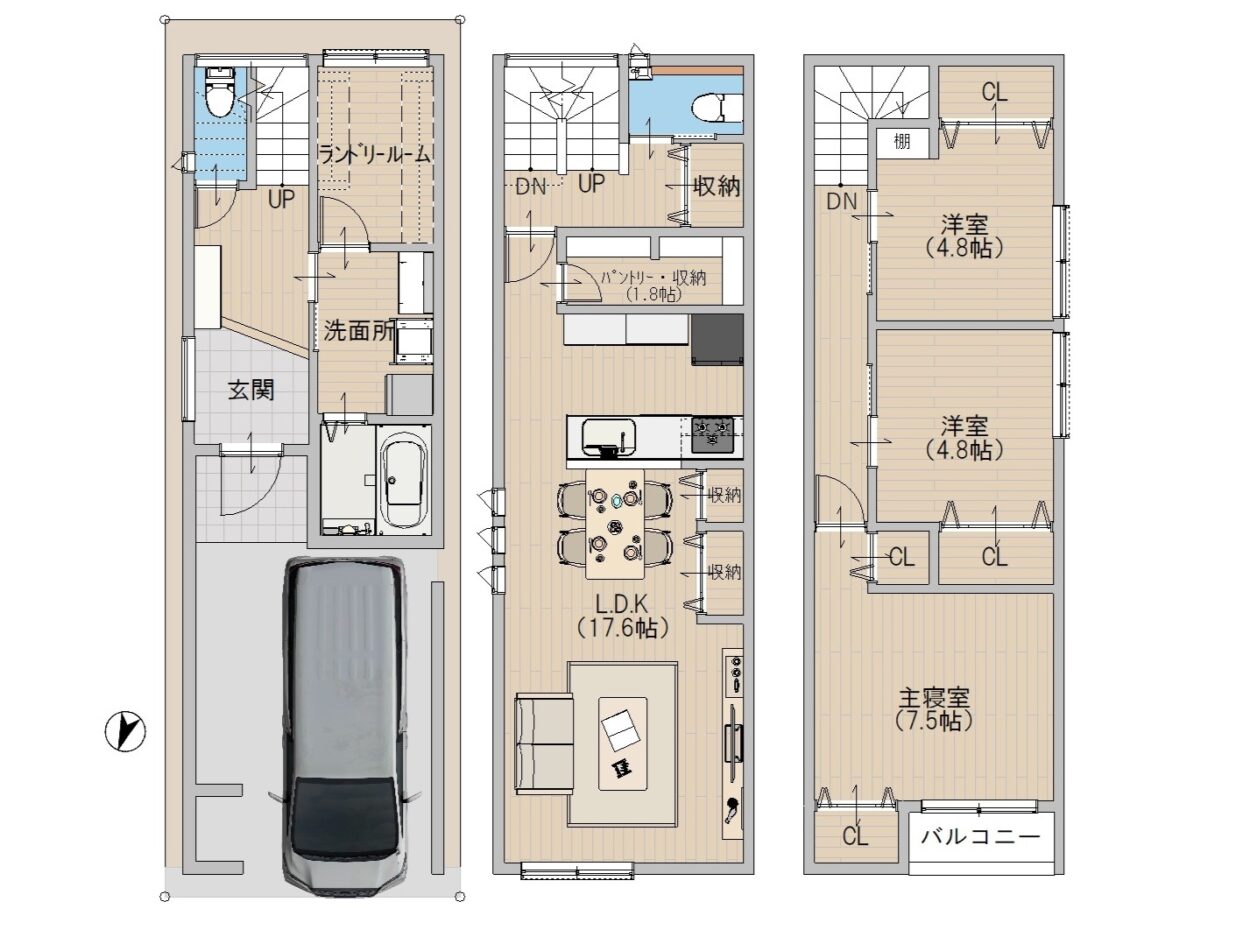 また、洗濯物を外干ししたい方にも対応可能です。間取りは一から自由に設計できるため、ご要望を丁寧にお伺いしながら、コーディネーターと一緒に最適なプランをご提案いたします。POINT〇各居室にはそれぞれクローゼットを備えているため、お部屋をすっきりと広くお使いいただけます。さらに2階には、パントリーに加えて大型の収納スペースも設けており、季節物や日用品のストックなどもゆとりをもって収納できます。